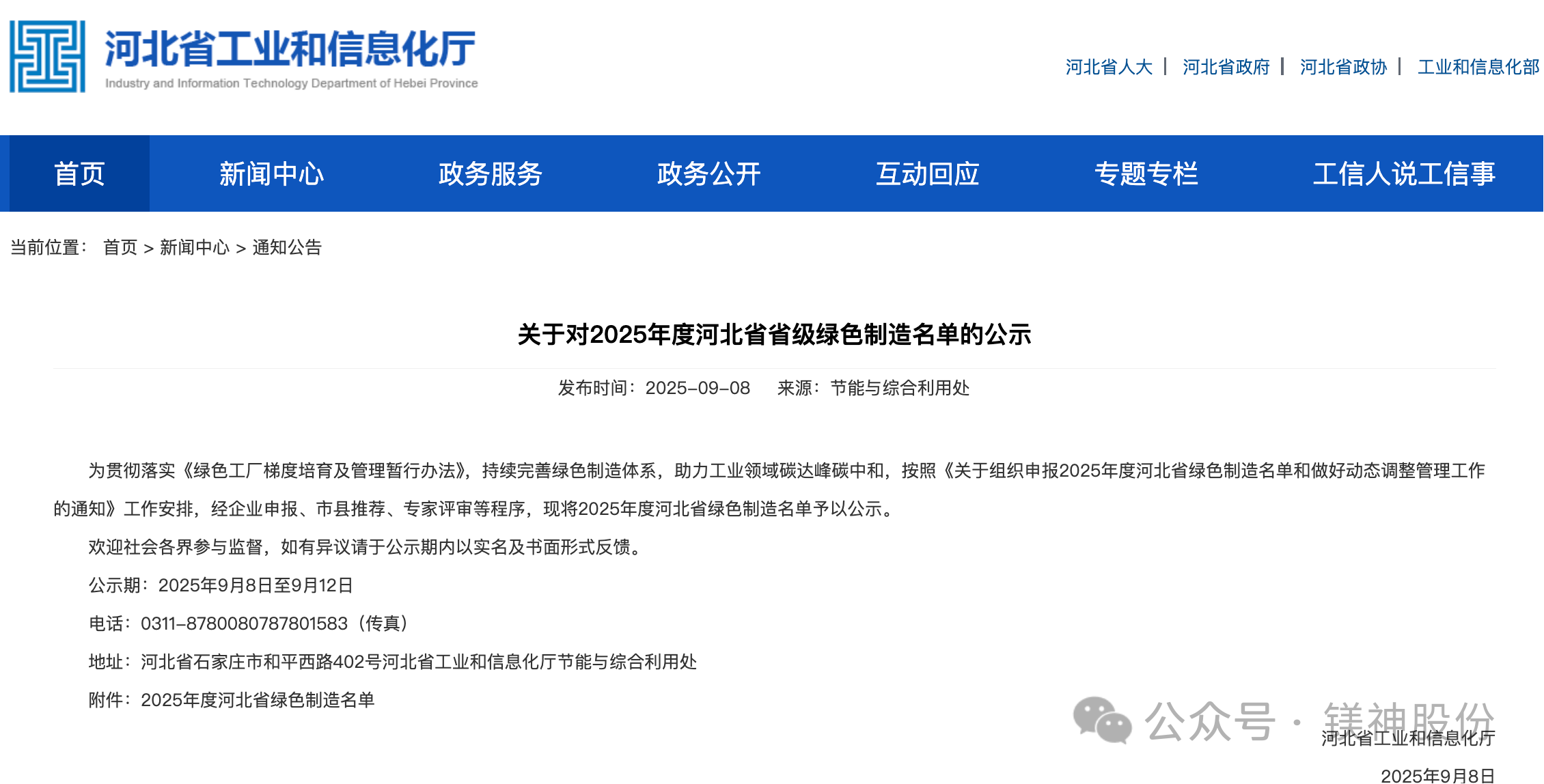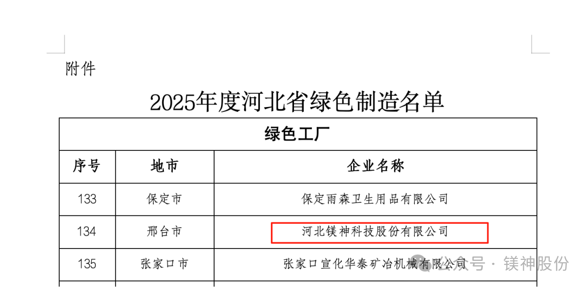 2025年9月8日,河北省工业和信息化厅正式公布了2025年河北省绿色制造名单。河北镁神科技股份有限公司(以下简称“镁神科技”)凭借在绿色制造、节能降耗、清洁生产等方面的突出表现,成功入选“2025年度河北省绿色制造名单”!这是公司积极践行绿色发展理念、扎实推进绿色体系建设取得的重大成果,也是对镁神科技绿色制造水平和可持续发展能力的认可!