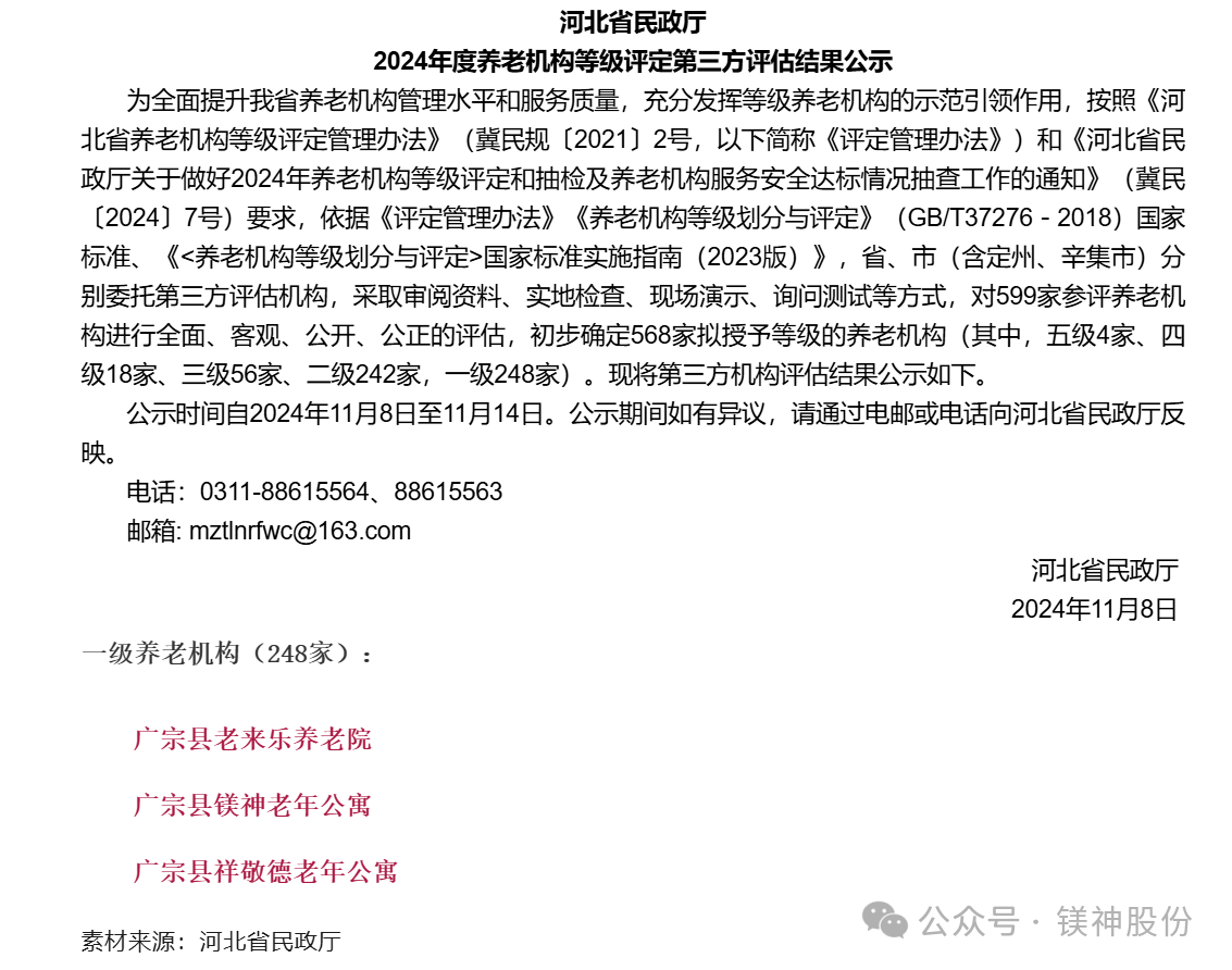 近日,河北镁神科技股份有限公司旗下的广宗县镁神老年公寓通过养老机构等级评定,获河北省一级养老机构。